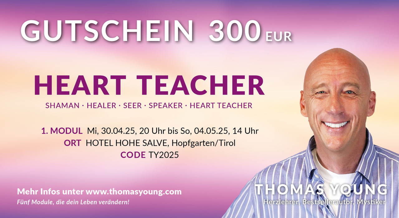 Herzlehrer Thomas Young lebt, was er spricht: „Wirkliche Transformation findet nur über das Herz statt, wer sich fest im Herzen verankert, geht den Weg der Eingeweihten.“ Thomas Young vermittelt besondere Techniken, die eigene Herzenergie direkt zu erleben. Auf Reisen um die Welt hat der hellsichtige Mystiker mehrere Herzeinweihungen erfahren, die ihn verwandelt haben. Diese besonderen Erfahrungen und den daraus resultierenden Lebensweg als Herzlehrer hat er präzise beschrieben in dem Bestseller WILLKOMMEN IM HERZEN, einem mitreissenden Seelenbuch.